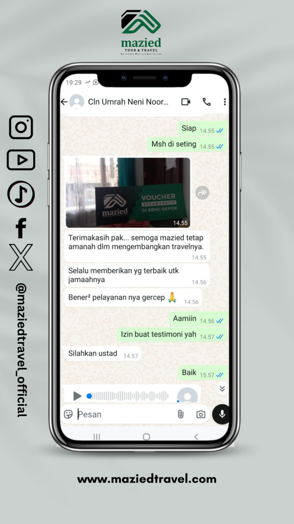 Rasakan pengalaman ibadah umroh yang aman, nyaman, dan penuh keberkahan bersama Mazied Tour & Travel, mitra terbaik perjalanan ibadah Anda.